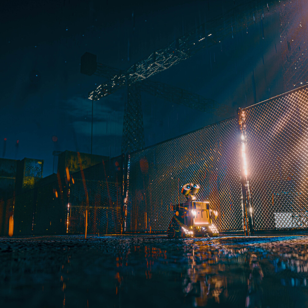 Discover Wall-E in a rainy night atmosphere, surrounded by stacked containers and metal fences. This 3D render, created with Blender, highlights the meticulous details and unique ambiance of a deserted port under the rain.